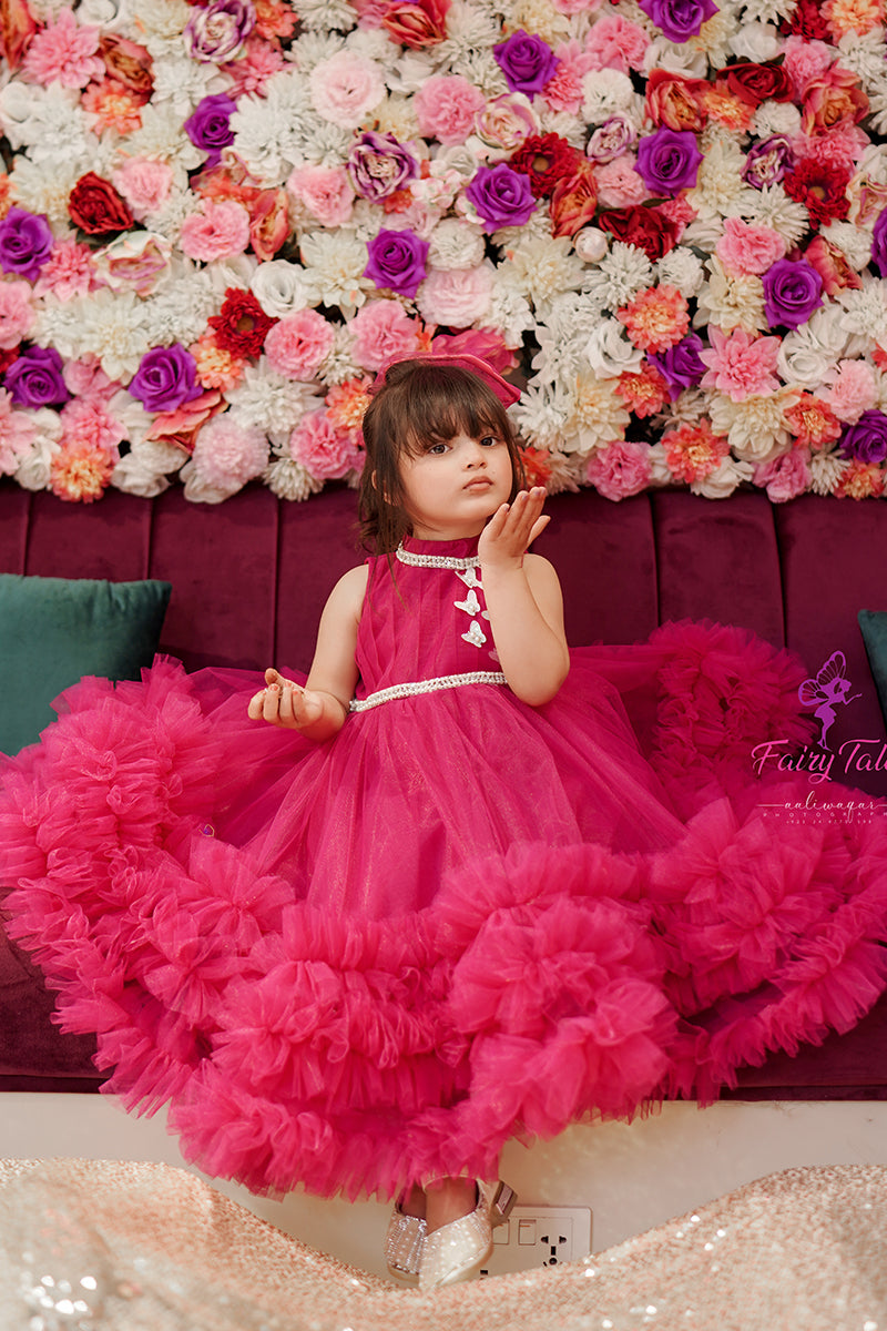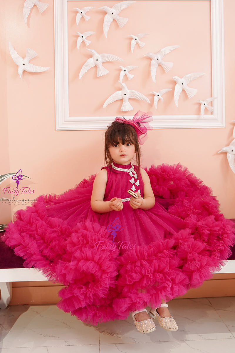 This is a beautiful pink Cosmos dress from the KIDS FASHION Summer Collection. The dress is designed for ages 1 to 12 years and features a voluminous, ruffled, and layered tulle skirt in a vibrant shade of pink. The bodice features an intricate lace-up detail that adds an elegant touch and ensures a snug fit. The dress is tea/knee-length and is perfect for any summer occasion.