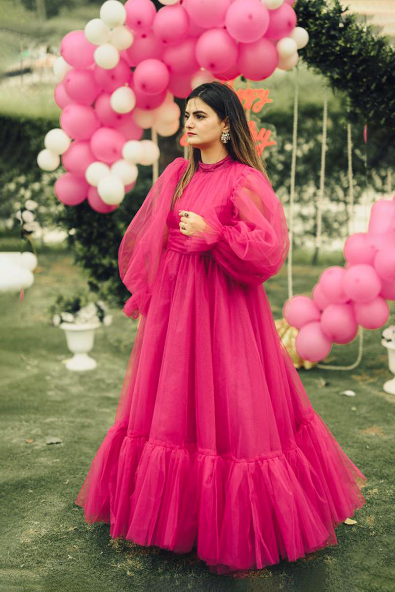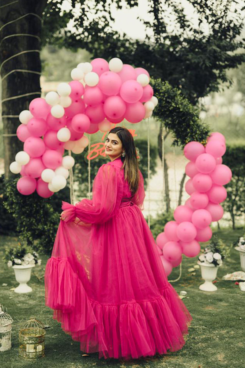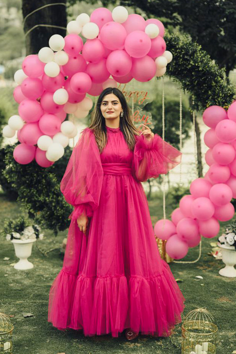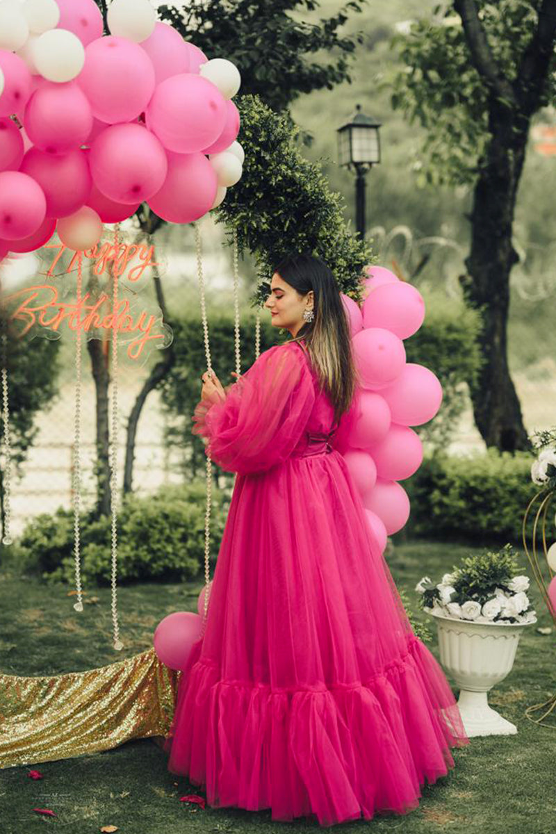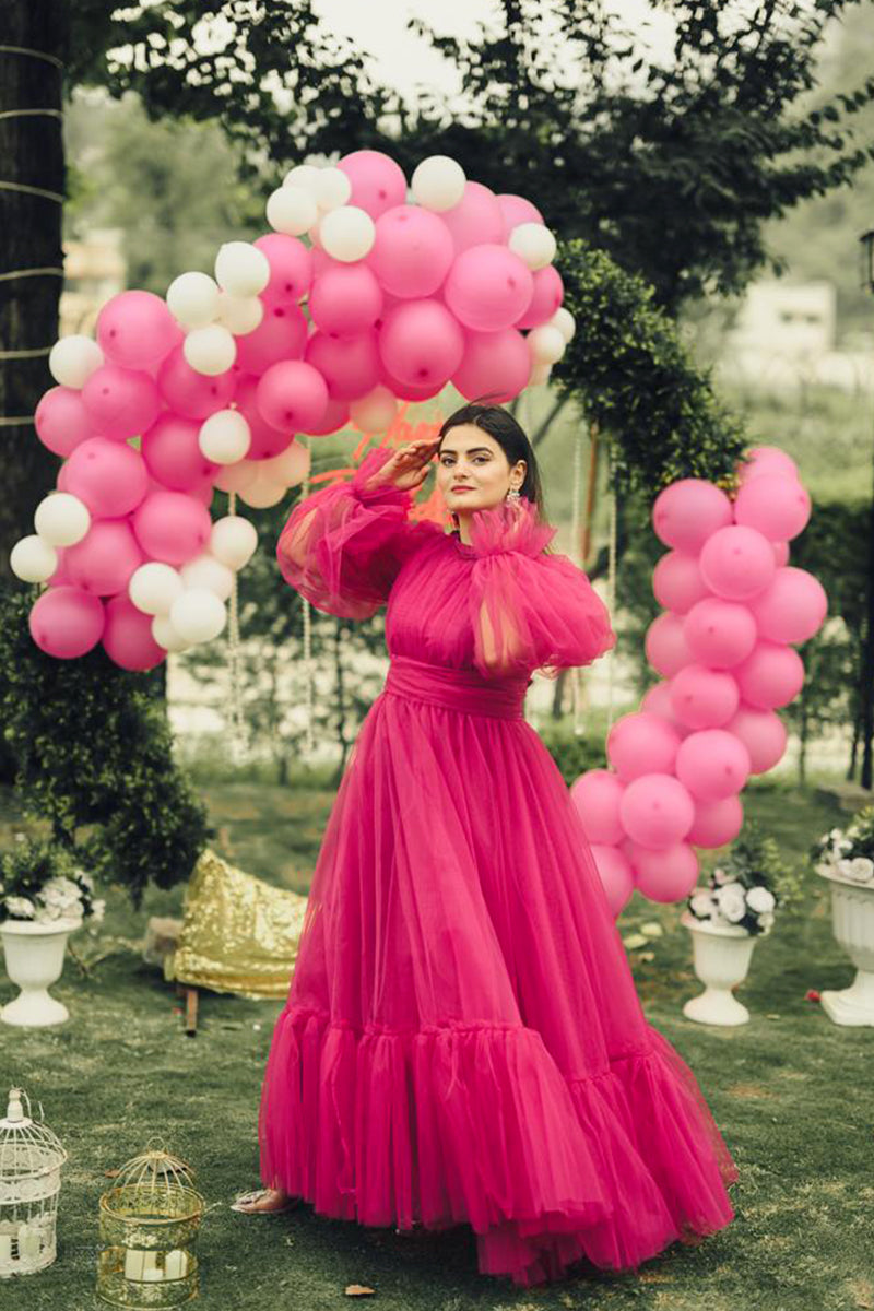 This is the “EVE” dress, a luxurious gown that epitomizes elegance and sophistication. The radiant pink hue complements every skin tone, making it a versatile choice for various occasions. The voluminous sleeves add a touch of royal grace, while the cinched waistline accentuates the natural curves, offering a flattering silhouette. The dress is part of the “Fairy Gowns / Tail” collection in the “ADULT’S FASHION” category. The image shows a person wearing the dress with their face obscured. They are standing outdoors near greenery and an arch made of pink and white balloons. The dress is available in multiple sizes and colors, ensuring an impeccable fit for every body type.