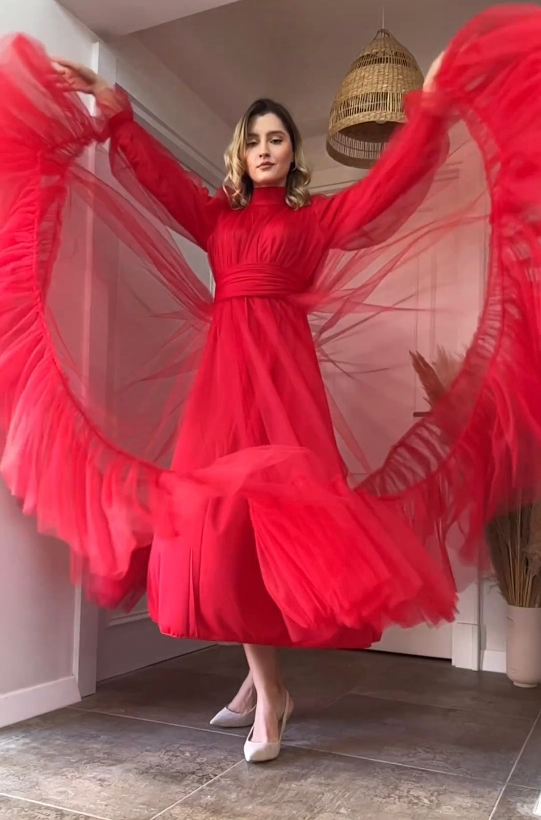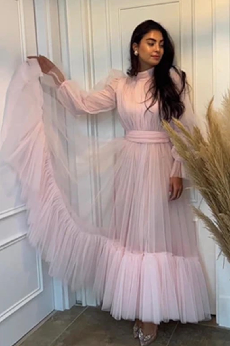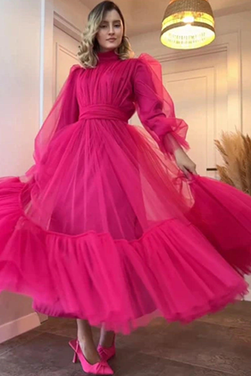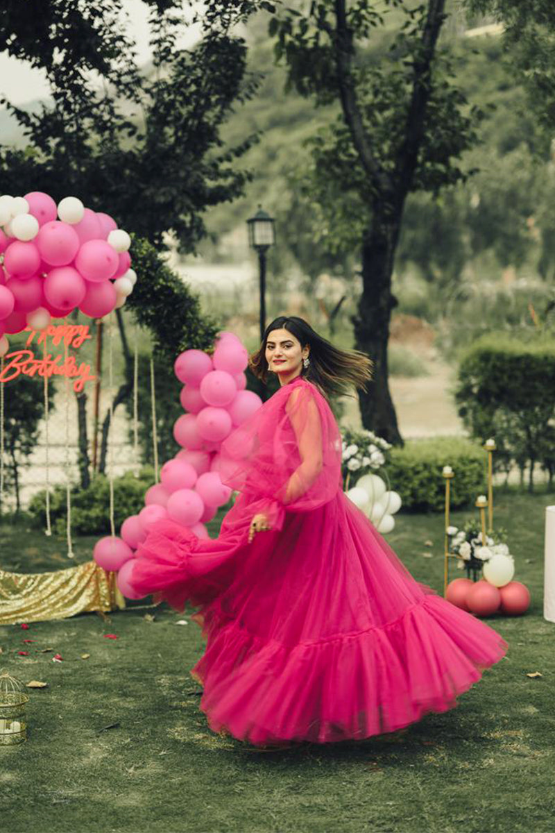 This is the “EVE” dress, a luxurious gown that epitomizes elegance and sophistication. The radiant pink hue complements every skin tone, making it a versatile choice for various occasions. The voluminous sleeves add a touch of royal grace, while the cinched waistline accentuates the natural curves, offering a flattering silhouette. The dress is part of the “Fairy Gowns / Tail” collection in the “ADULT’S FASHION” category. The image shows a person wearing the dress with their face obscured. They are standing outdoors near greenery and an arch made of pink and white balloons. The dress is available in multiple sizes and colors, ensuring an impeccable fit for every body type.