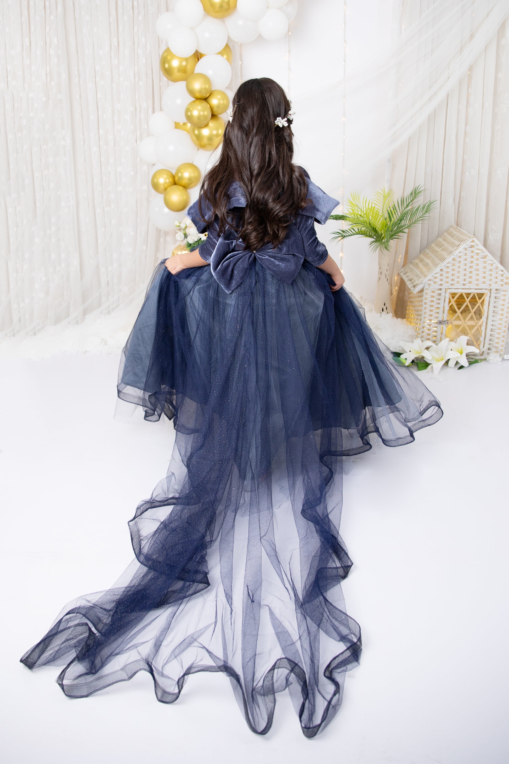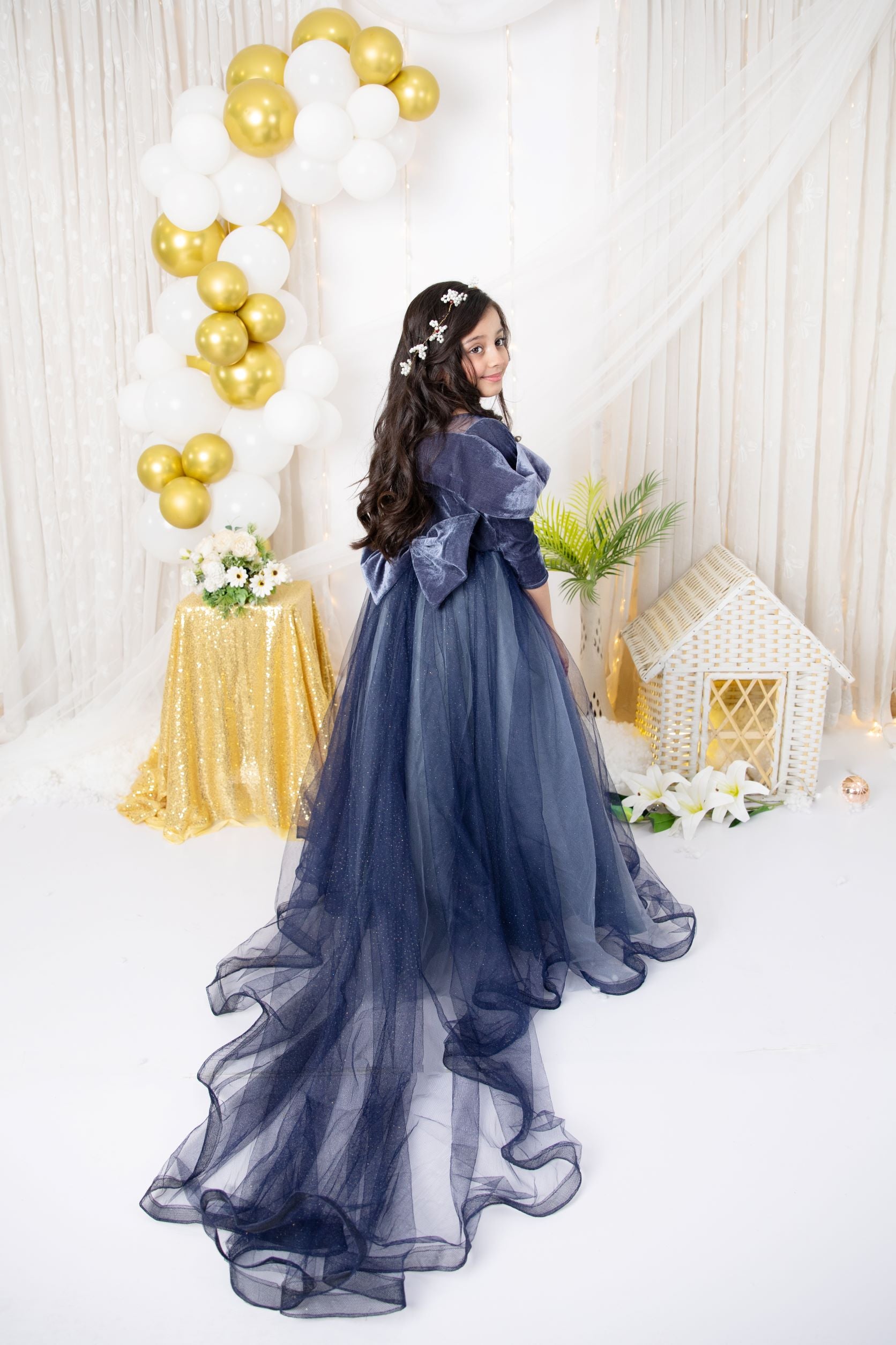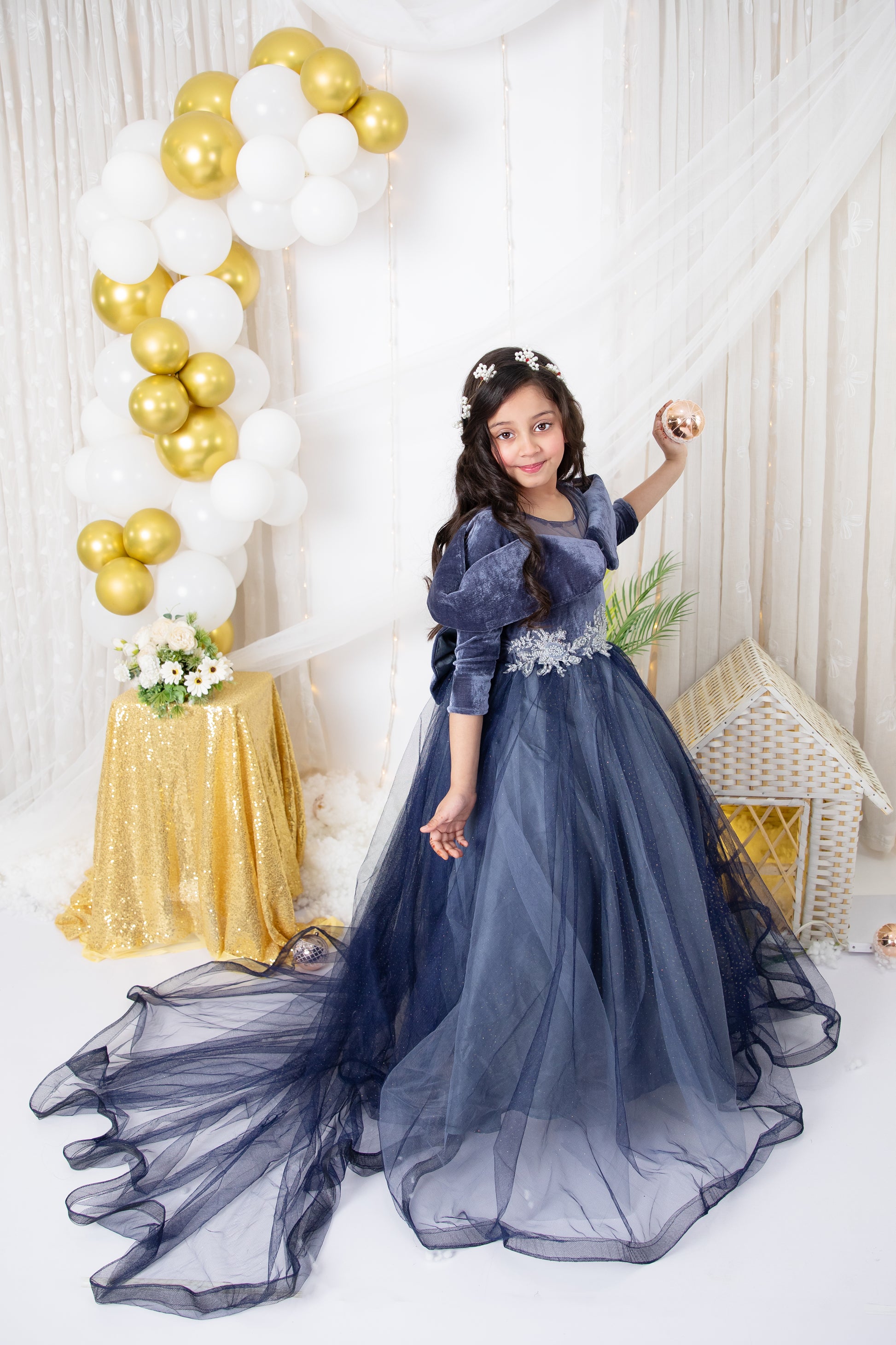 A young girl in a formal navy blue dress with a long train, featuring floral patterns and half-length sleeves, standing in front of a backdrop with golden balloons.