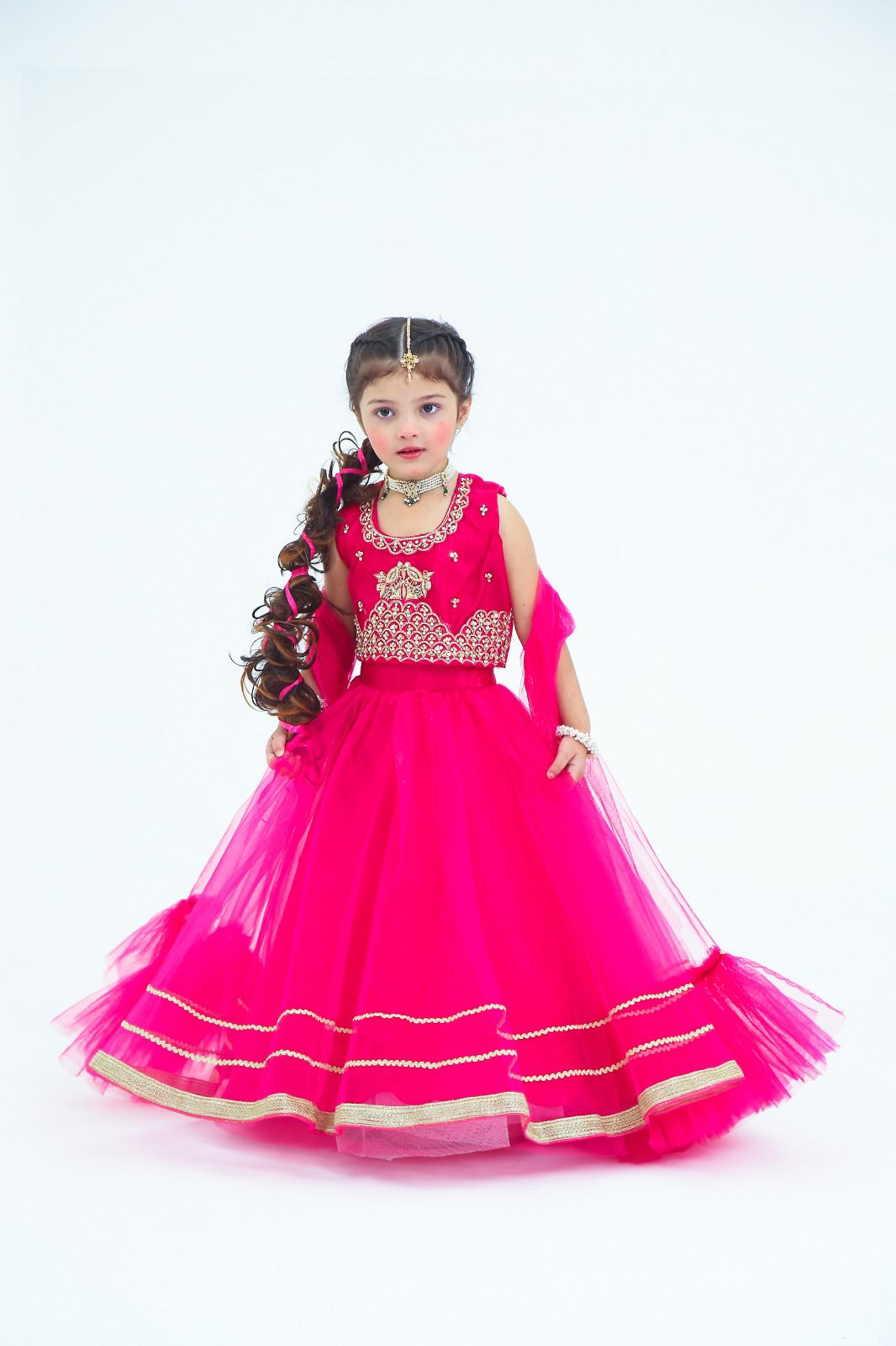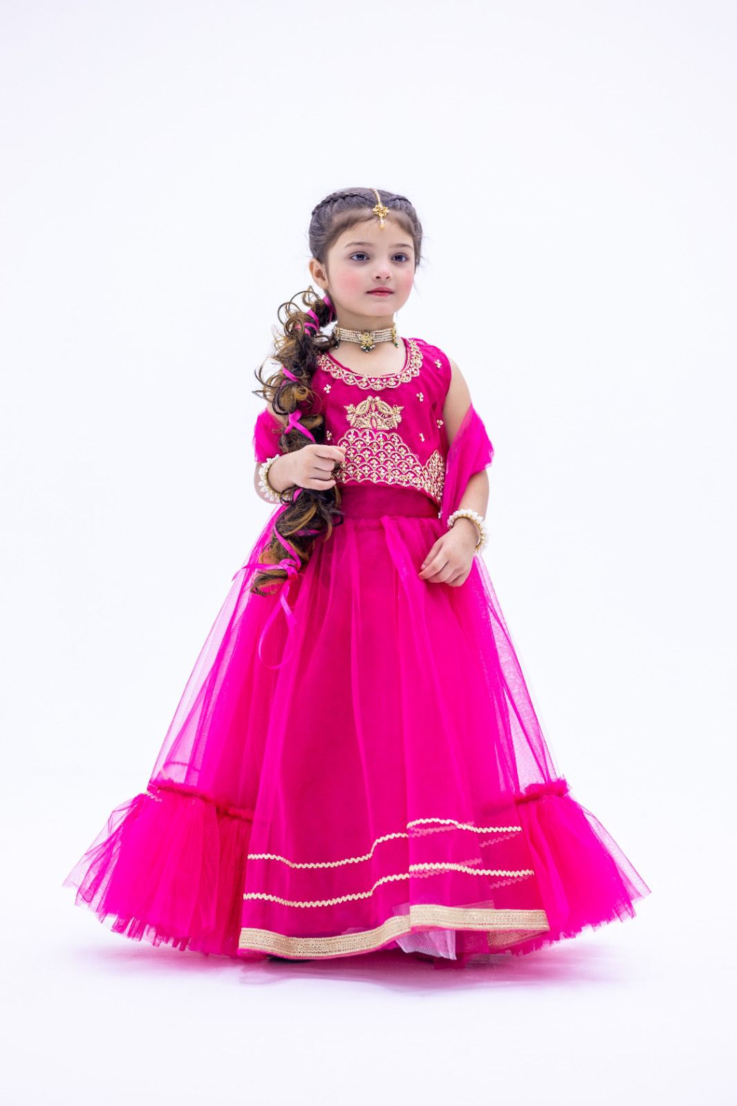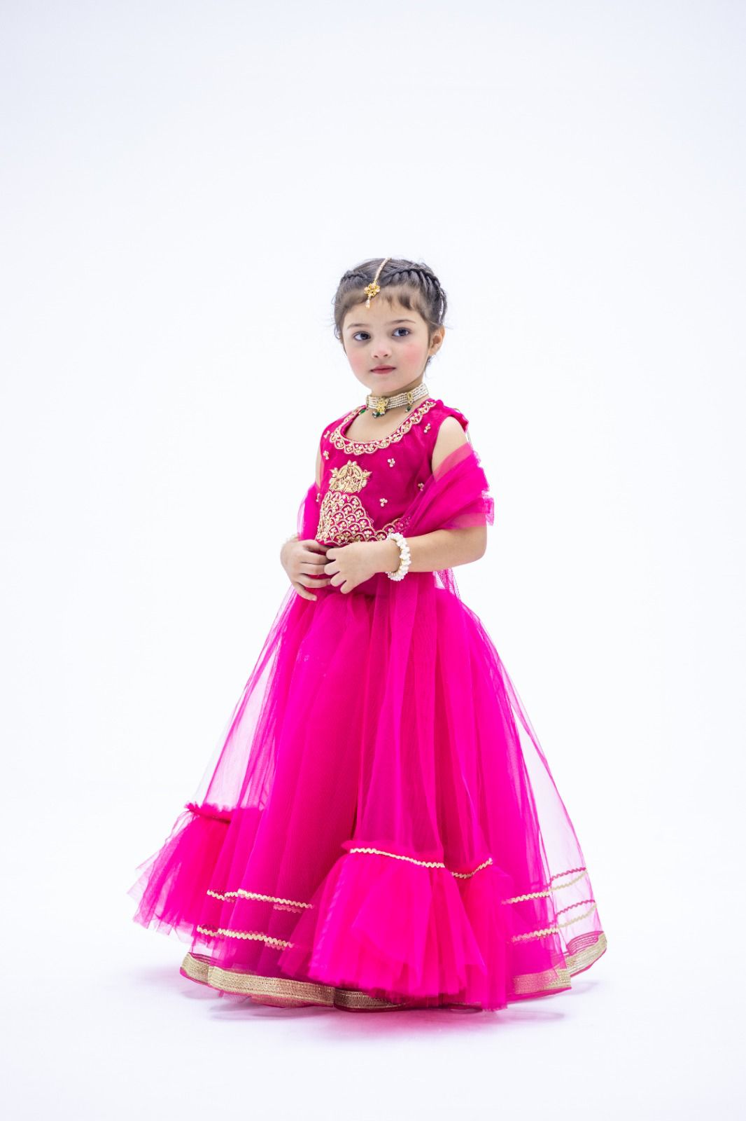 Description: This choli is embellished with hand work coura , dabka and resham paired up with net and silk lehnga and net dupatta.