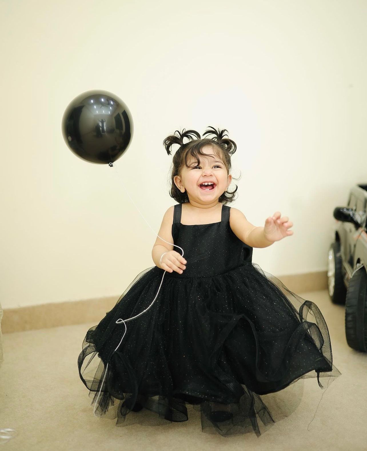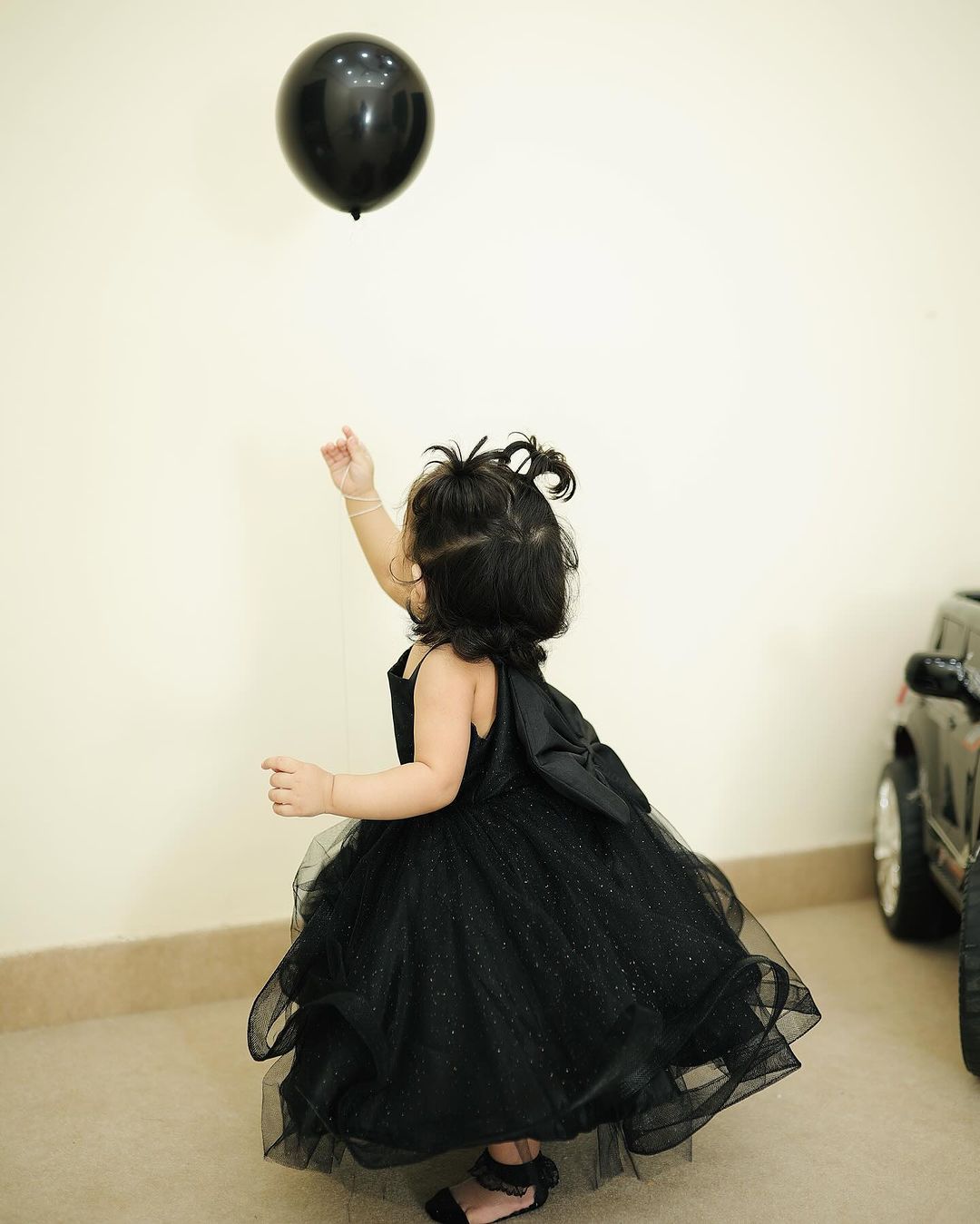 A child in a black dress with black hair, smiling and playing with a balloon near a black car.
