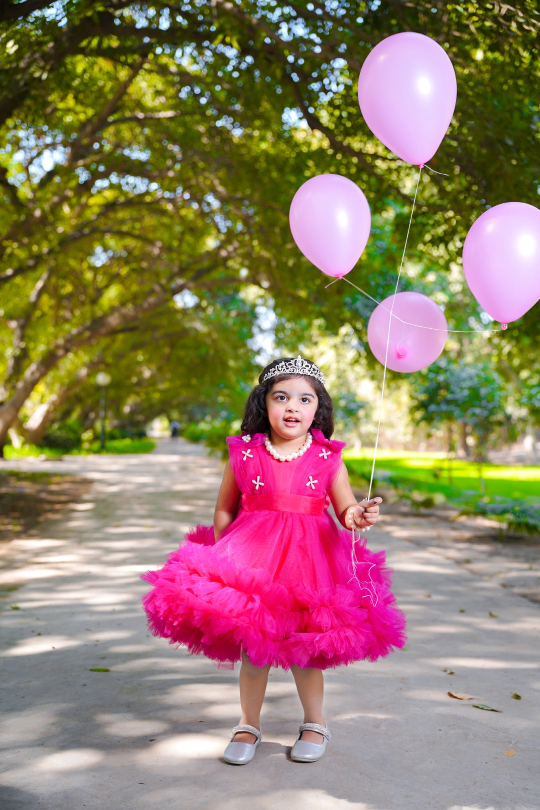 Experience the elegant and luxurious style of Tutu Cosmos. This beautifully designed tutu features stunning pearlescent embellishments on a shocking pink imported net fabric. Elevate your dance or performance with this eye-catching piece.